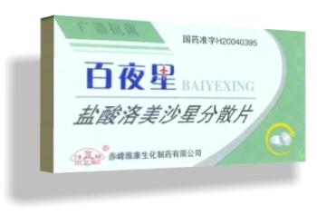 【通用名稱】鹽酸洛美沙星分散片 【商品名稱】百夜星 【主要成份】鹽酸洛美沙星,其化學名為1-乙基-6,8-二氟-1,4-二氫-7-(3-甲基-1-哌嗪基)-4-氧代3-喹啉羧酸鹽酸鹽。 【功能主治】下呼吸道感染:慢性支氣管炎急性發(fā)作、支氣管擴張伴感染、急性支氣管炎、肺炎等。腹腔膽道、腸道、傷寒等感染。皮膚軟組織感染。其它感染:如副鼻竇炎、中耳炎、眼瞼炎。 【用法用量】口服。每日0。6g,分2次服。病情較重者可增至每日0。8g,分2次服。單純性尿路感染1次0。4g,每日1次。單純性淋病,每日0。6g,分2次服。或遵醫(yī)囑 【產(chǎn)品規(guī)格】0。1g 【批準文號】囯藥準字H20040395 【有 效 期】暫定24月 【生產(chǎn)企業(yè)】赤峰維康生化制藥有限公司